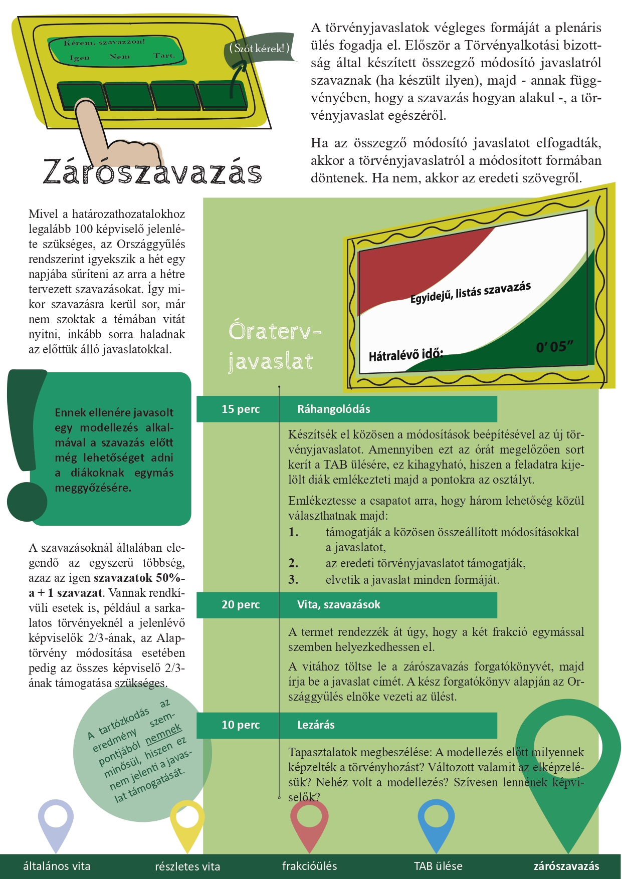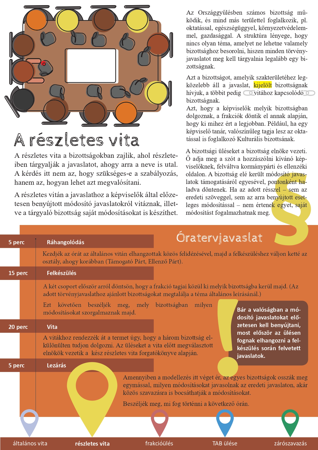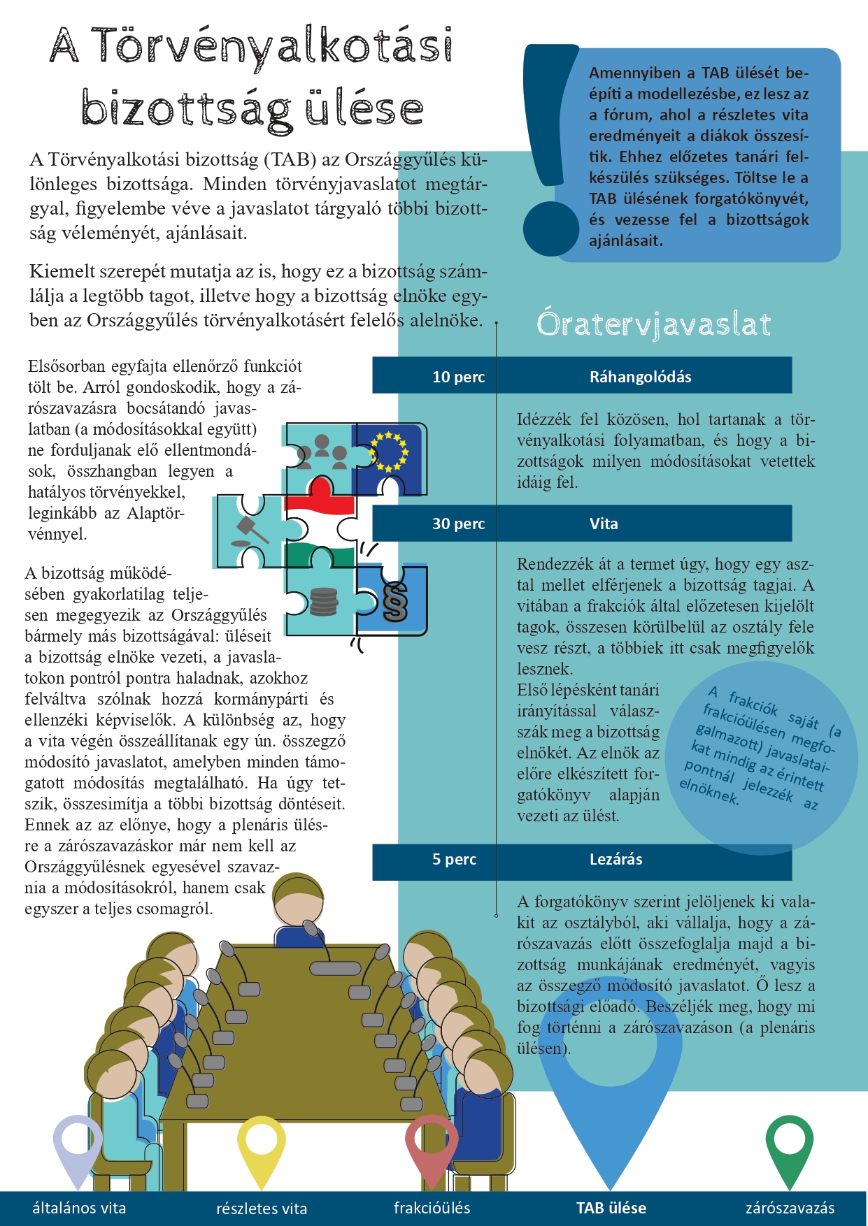 A törvényalkotási folyamat komplexebb bemutatásához érdemes több tanórát rászánni a munkára. Az alábbi anyagok összesen 5 tanórát vesznek igénybe, azokból igény szerint kiválaszthatók a bemutatni kívánt elemek.