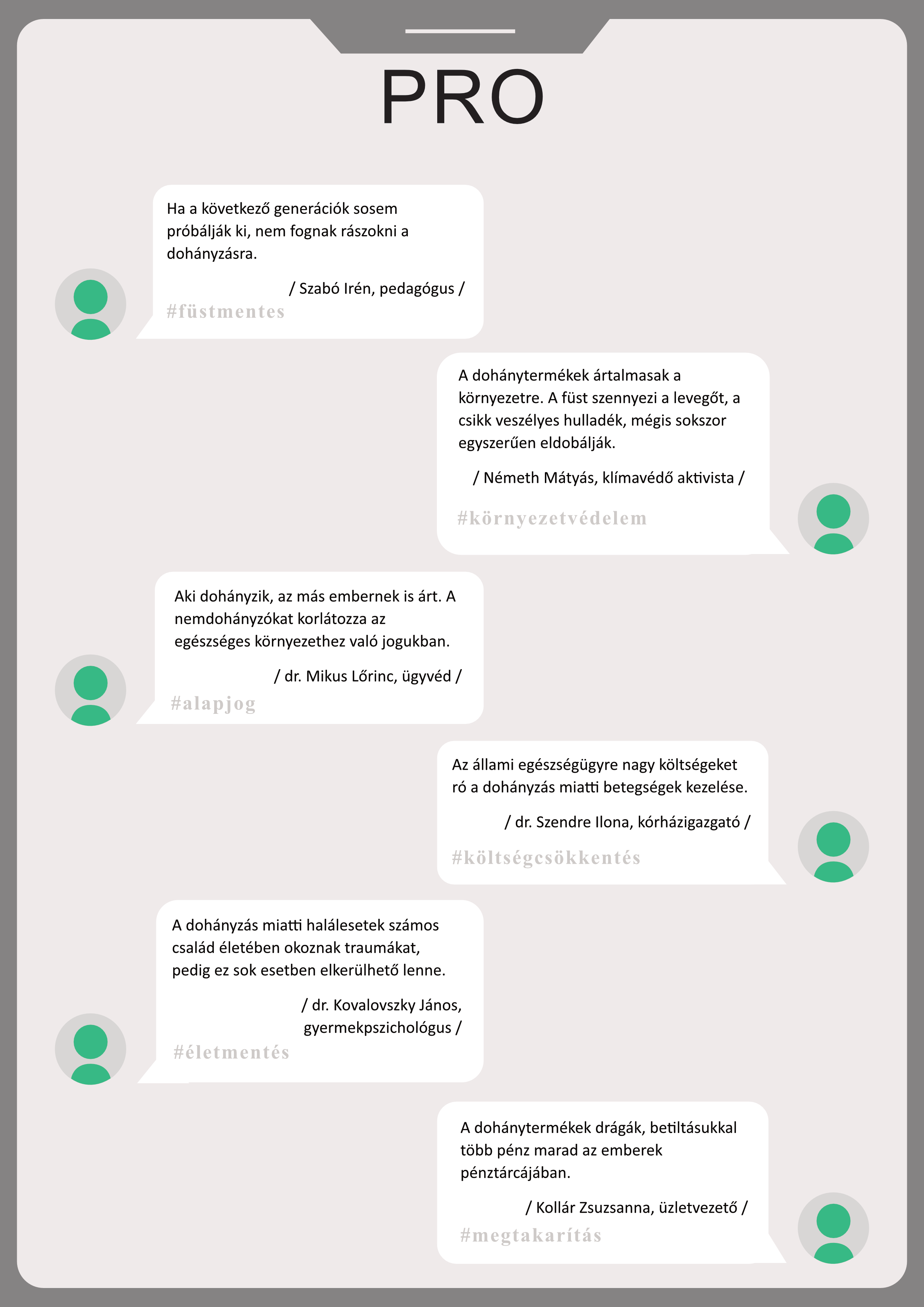 Pro és kontra érveket tartalmazó tablók A tablók az álláspontok kialakításában nyújtanak segítséget: a mellett és az ellen sorakoztatnak fel érveket, hogy be kellene-e tiltani a dohányzást. Letöltésükhöz kattintson a képekre! |